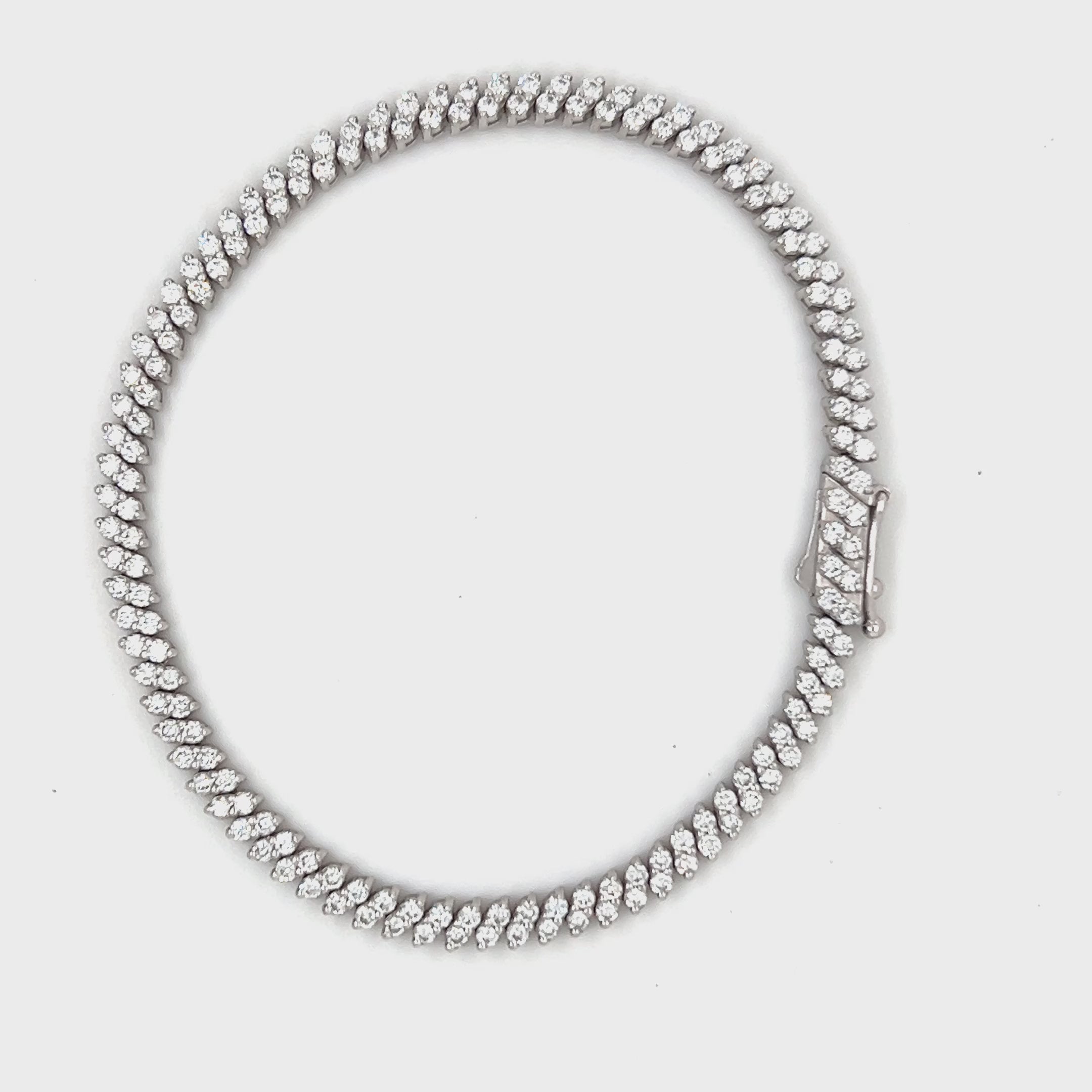 A fresh twist on the traditional tennis bracelet. Two round diamonds set together to create the illusion of marquise cut stones, giving the piece a modern, elongated look and extra brilliance.